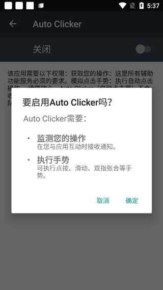 1、打开在autoclicker连点器,系统会提示开启(无障碍)服务,这里我们点击确定。