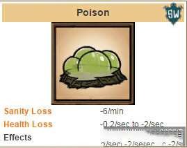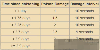玩家角色中毒后,所受的伤害并不是固定的,中毒伤害和中毒频率会随着中毒时间的增长变得更加致命。另外理智会以6点每分钟的速度降低,同时玩家的饥饿值降低会减缓20%。下面是中毒后伤害和频率的变化表: